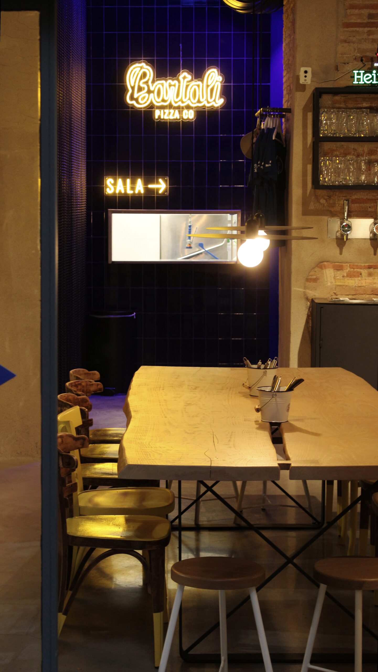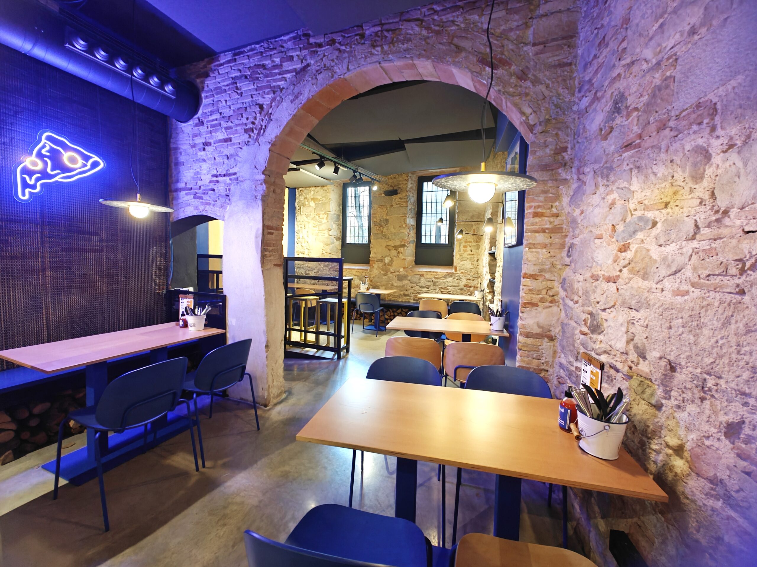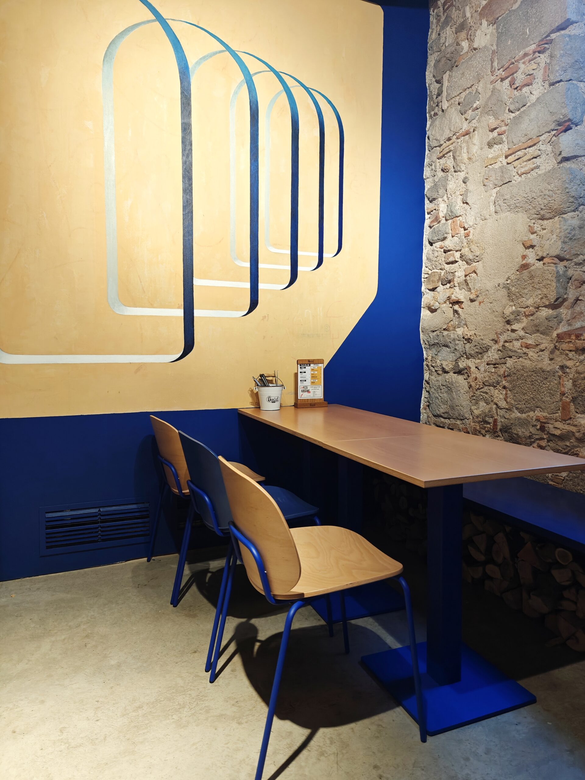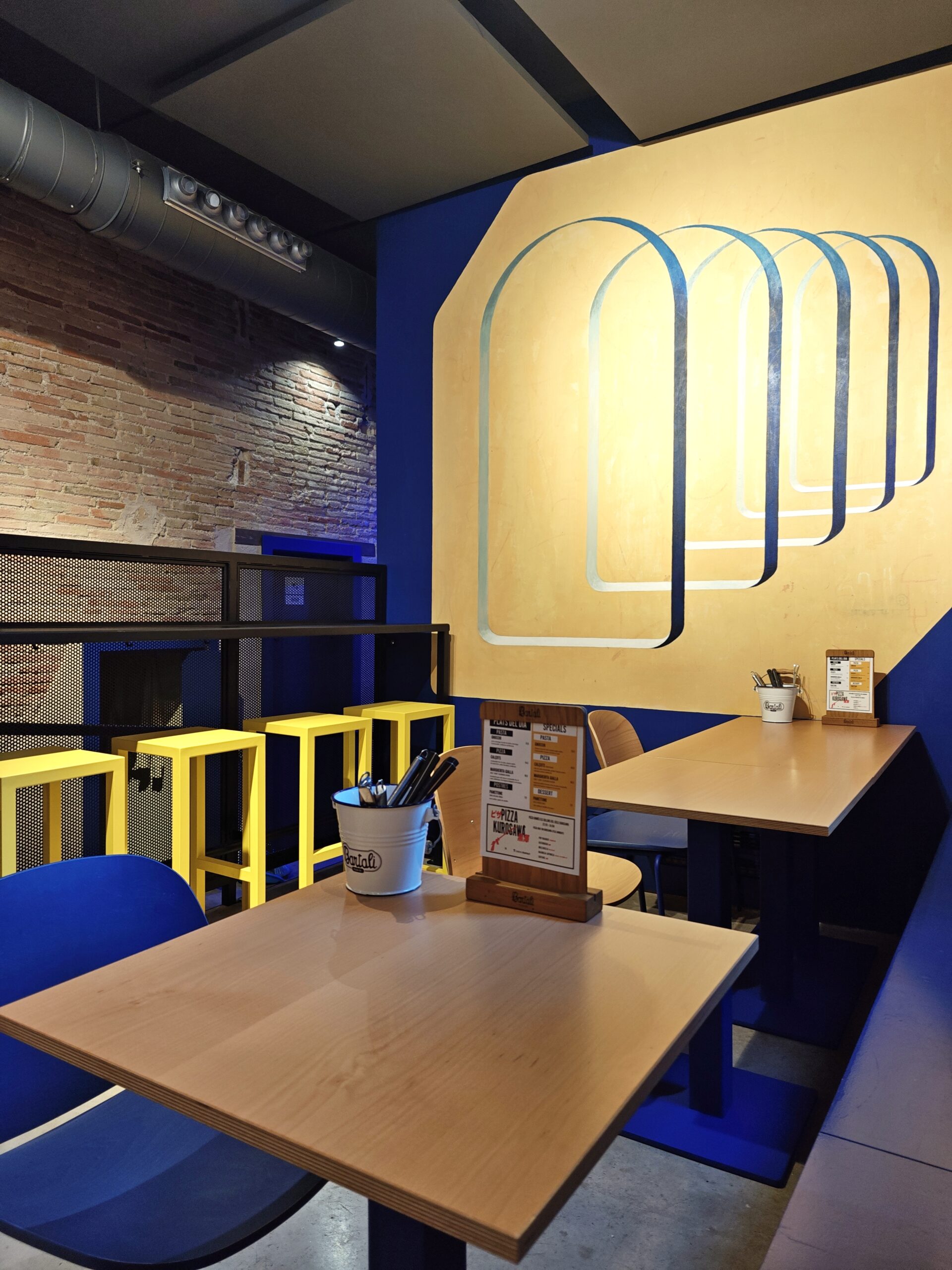 Reforma integral de la pizzeria Bartali. El concepte principal d’aquest disseny va ser girar entorn de la història de Gino Bartali, ciclista guanyador de tres premis del Giro d’Itàlia, també conegut per ajudar al poble jueu, per a això es va valer de la seva bicicleta, on amagava la documentació necessària per a treure’ls d’Itàlia. I així, sota l’aparença de simples entrenaments, portava els papers d’un costat a un altre. Vam decidir utilitzar com a colors corporatius d’aquesta reforma els colors que Gino portava en un dels seus mallots. El blau i el groc són colors complementaris i difícils en l’àmbit del disseny d’interiors, però vam decidir treballar amb el concepte del contrast en tot el restaurant, creant també un espai més informal i amb un estil industrial.
