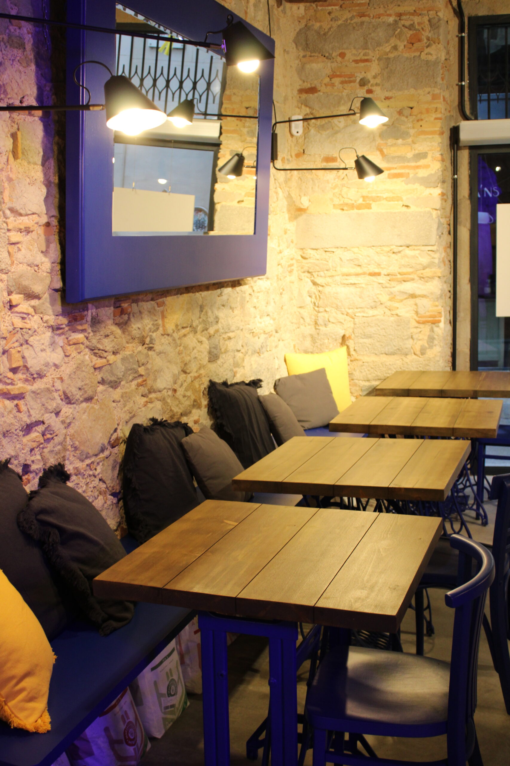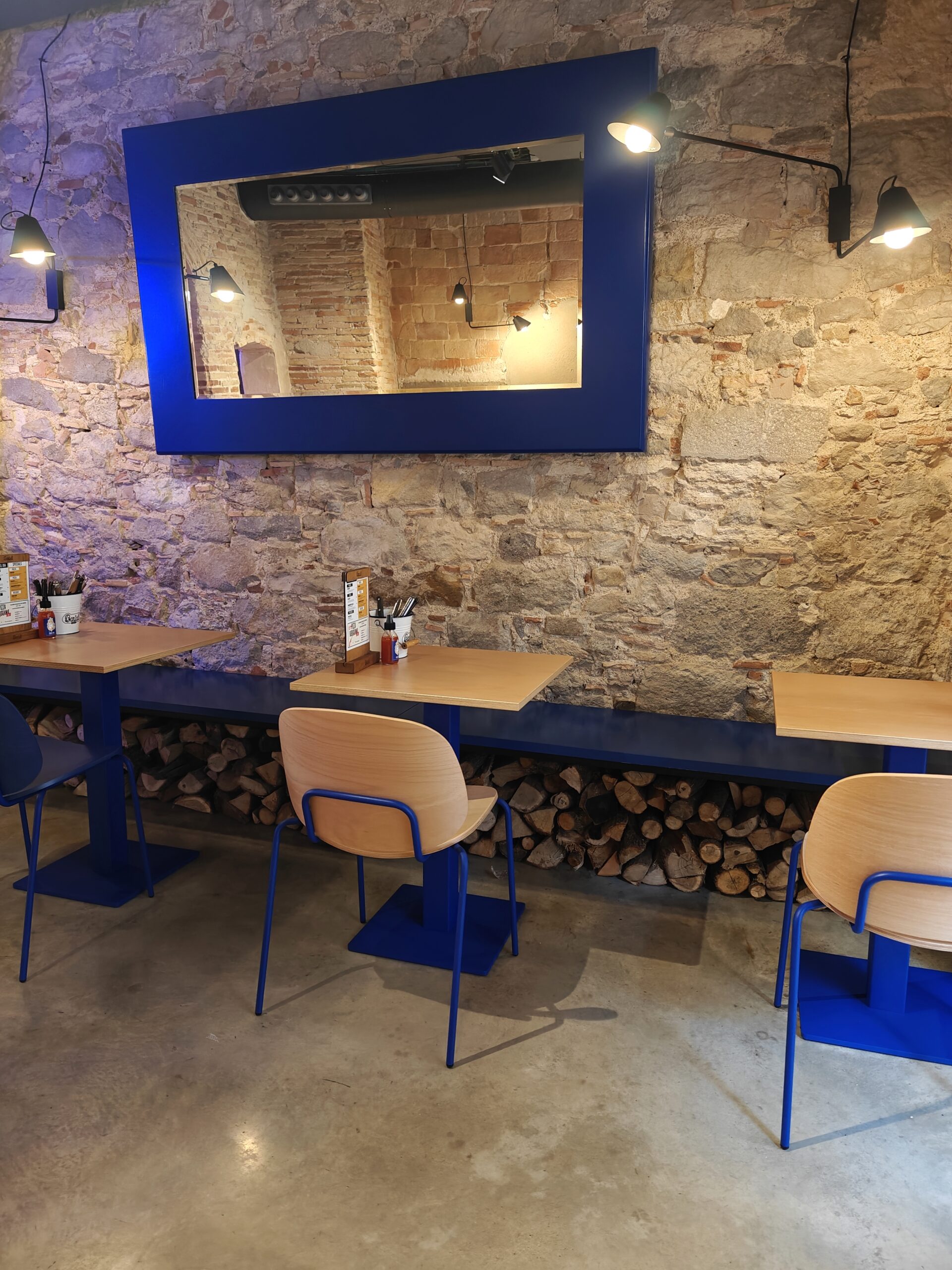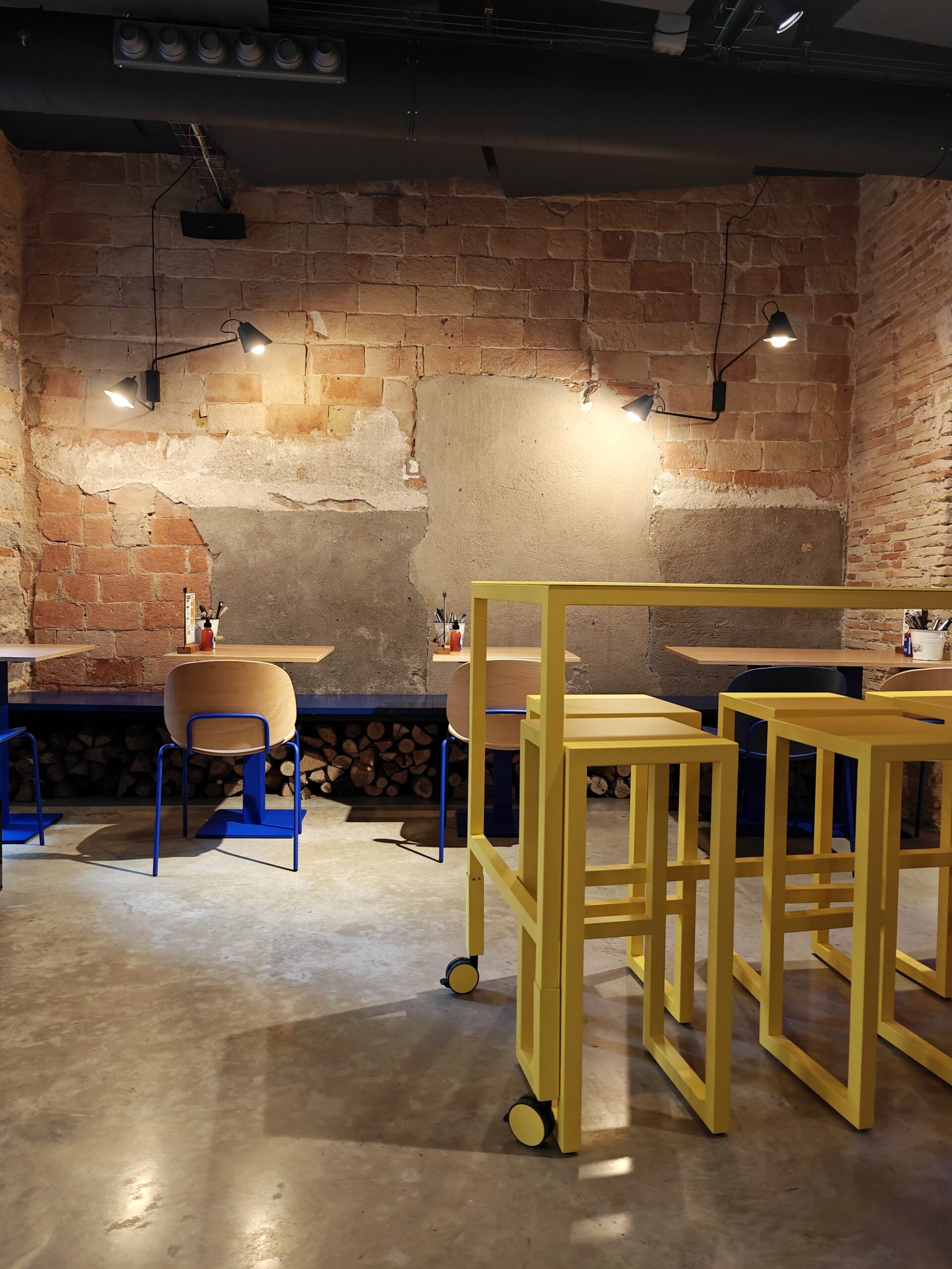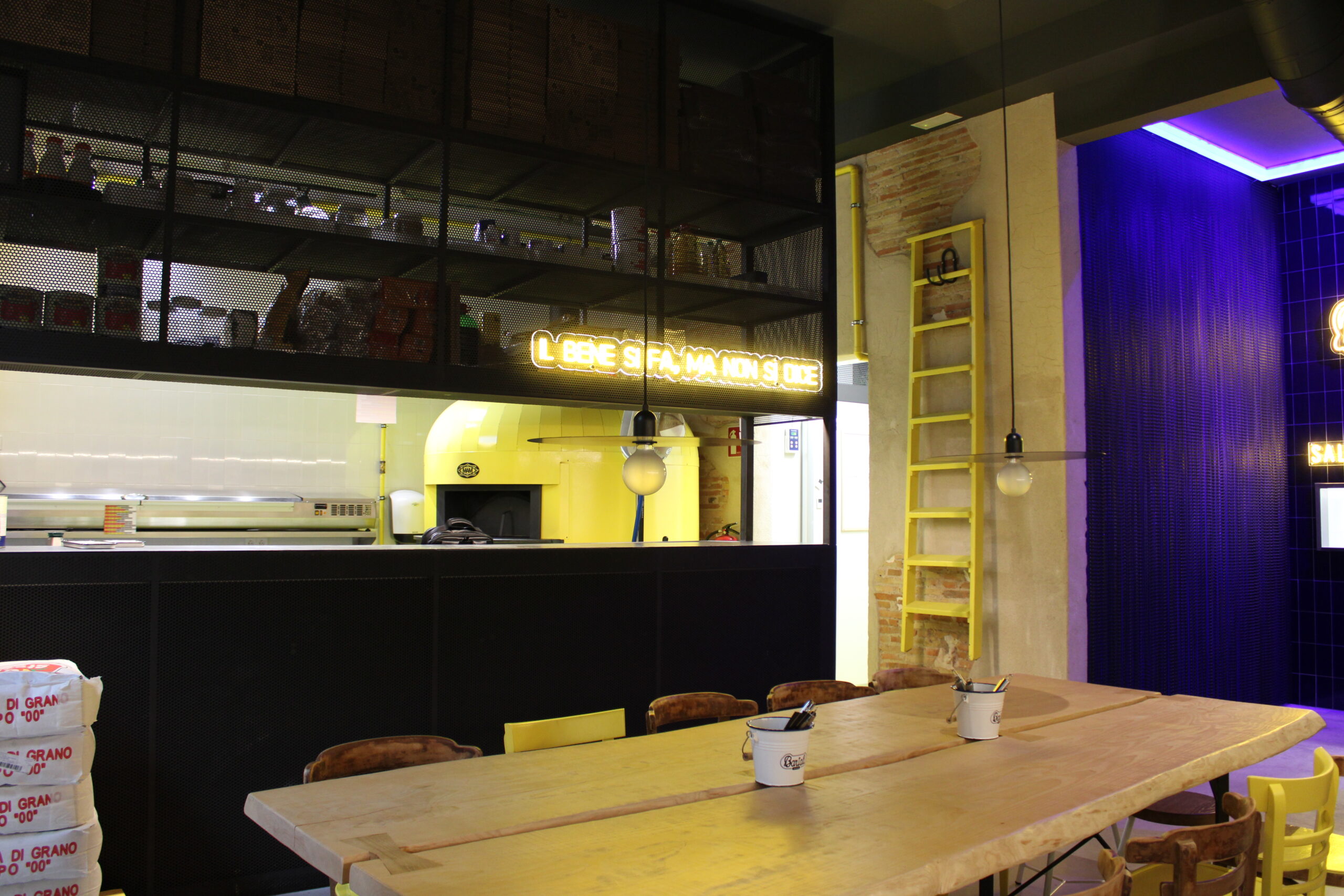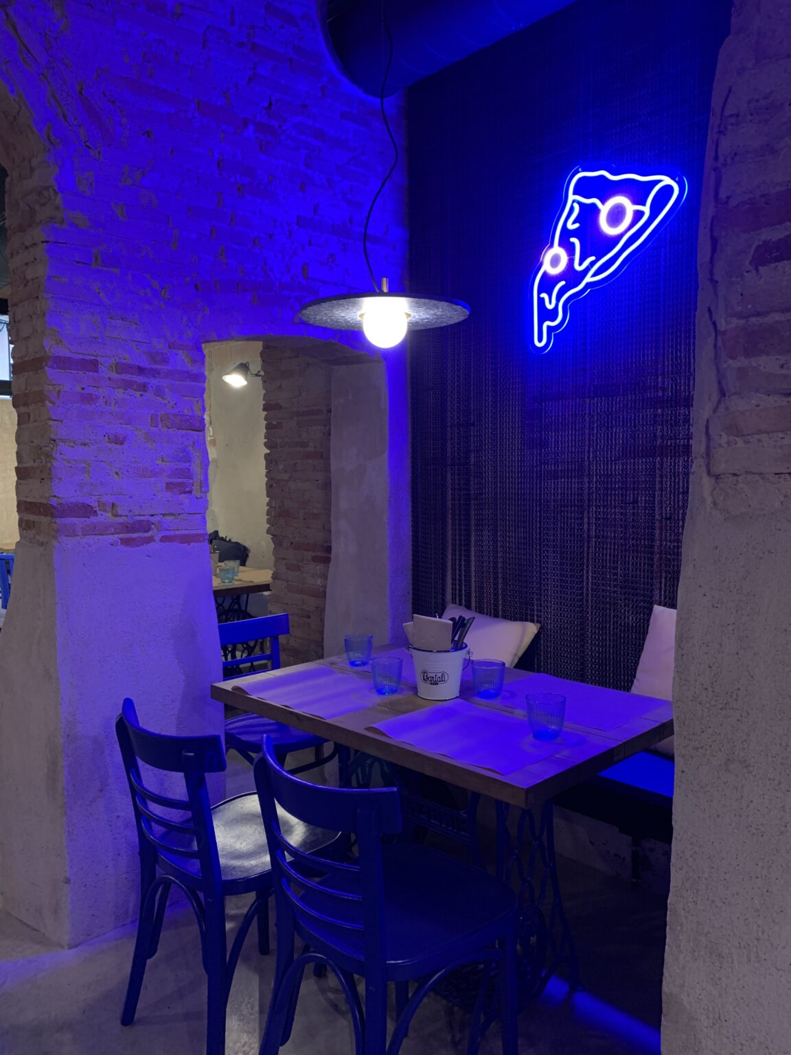 Reforma integral de la pizzeria Bartali. El concepte principal d’aquest disseny va ser girar entorn de la història de Gino Bartali, ciclista guanyador de tres premis del Giro d’Itàlia, també conegut per ajudar al poble jueu, per a això es va valer de la seva bicicleta, on amagava la documentació necessària per a treure’ls d’Itàlia. I així, sota l’aparença de simples entrenaments, portava els papers d’un costat a un altre. Vam decidir utilitzar com a colors corporatius d’aquesta reforma els colors que Gino portava en un dels seus mallots. El blau i el groc són colors complementaris i difícils en l’àmbit del disseny d’interiors, però vam decidir treballar amb el concepte del contrast en tot el restaurant, creant també un espai més informal i amb un estil industrial.