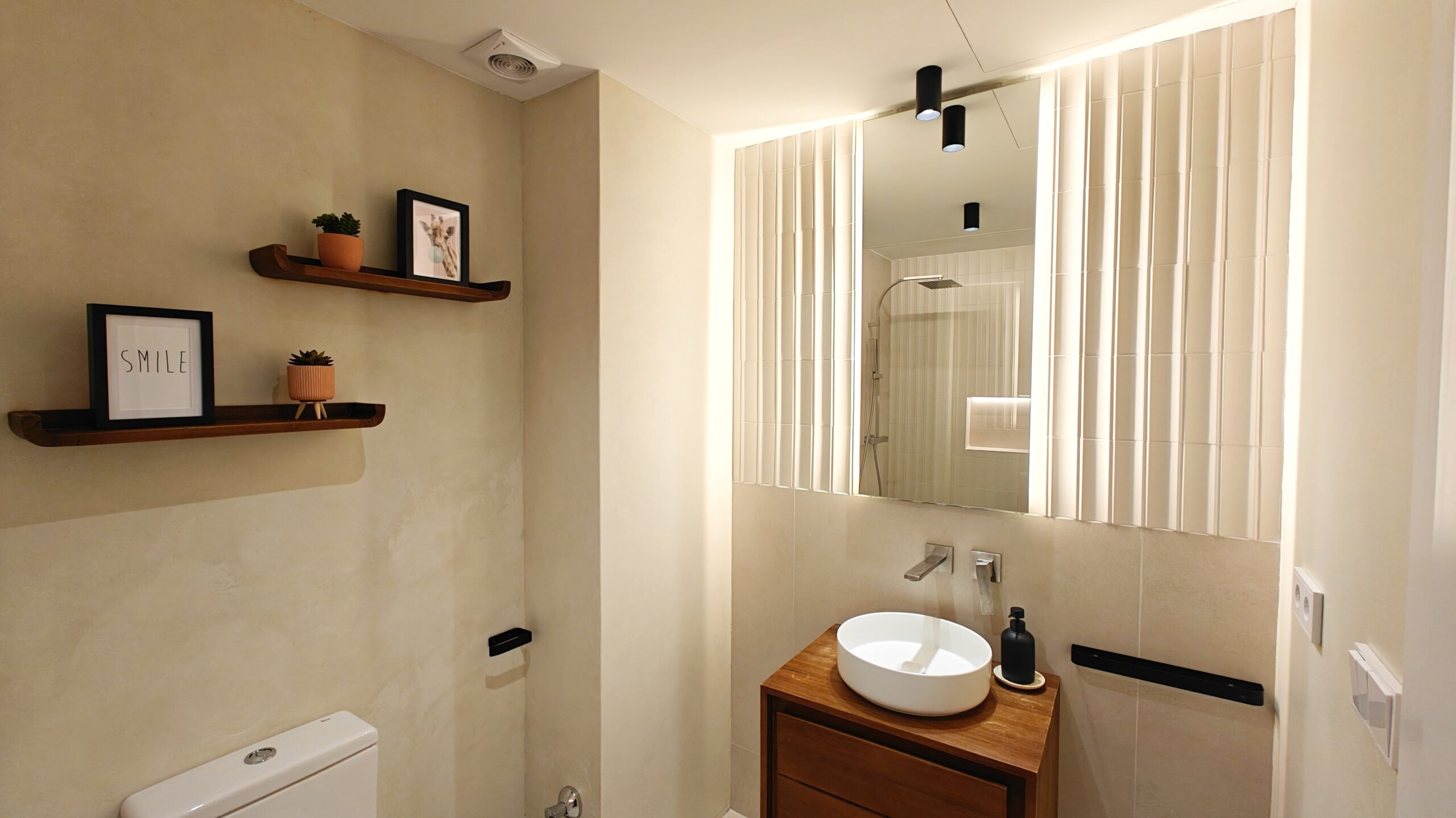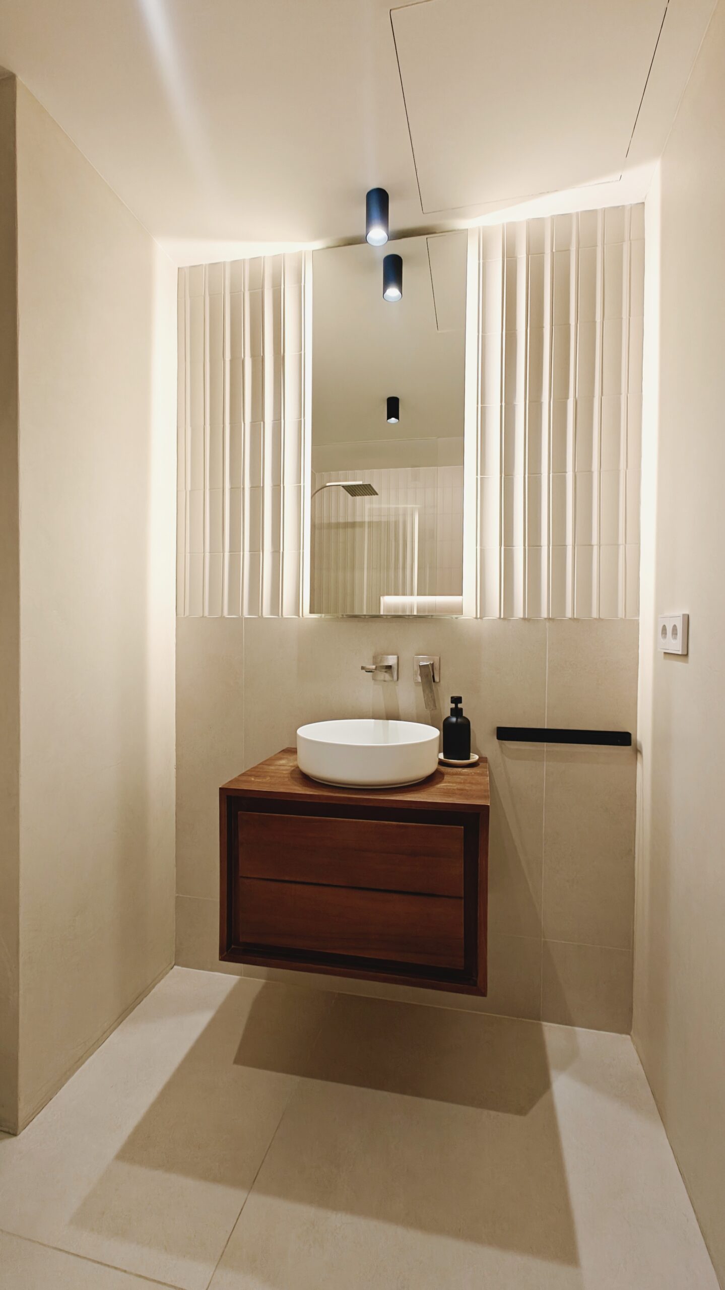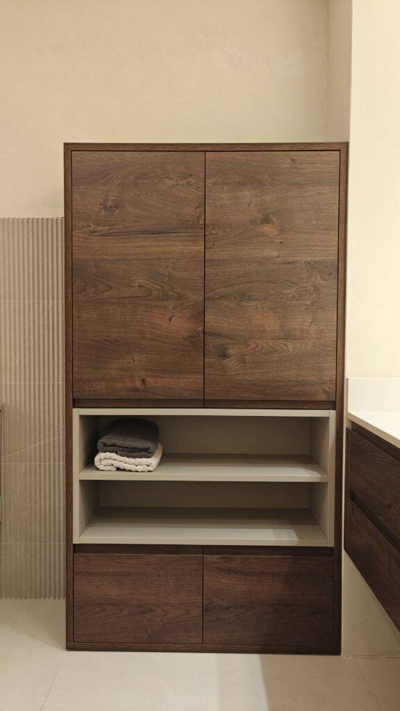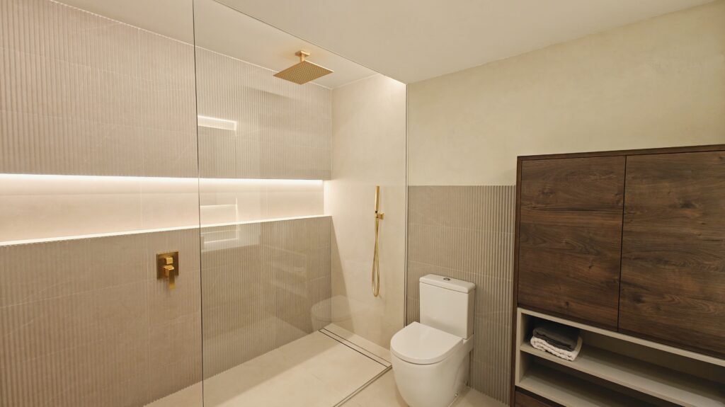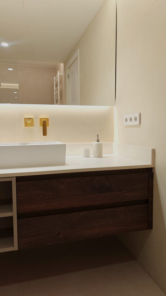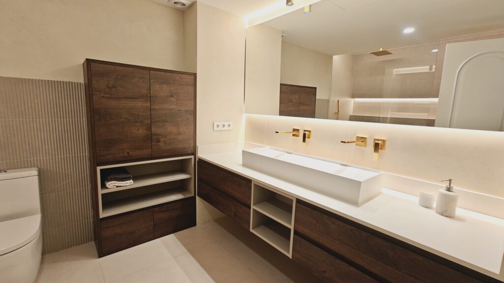Per reforçar la calidesa i aportar una elegància atemporal, s’han dissenyat a mida els mobles de bany en fusta contraxapada de noguera, un material noble que introdueix textura, profunditat i caràcter al conjunt. El resultat és un equilibri harmònic entre funcionalitat, estètica i experiència sensorial.