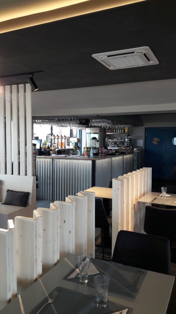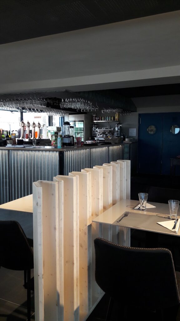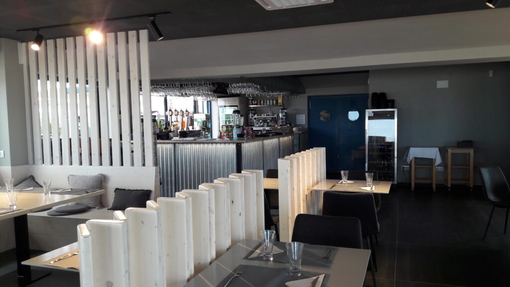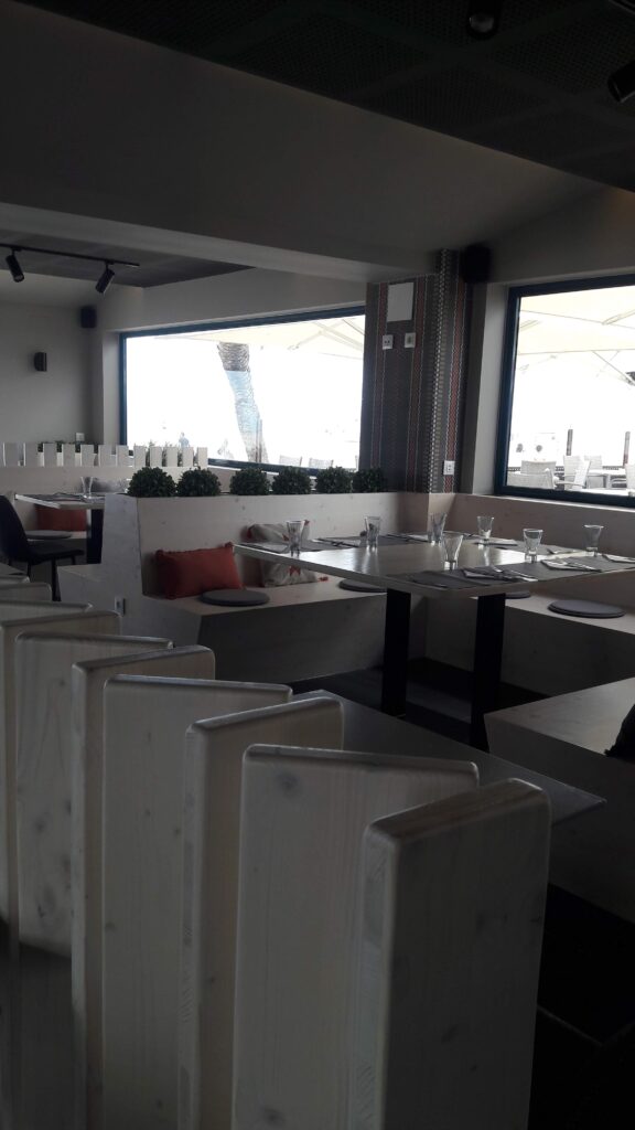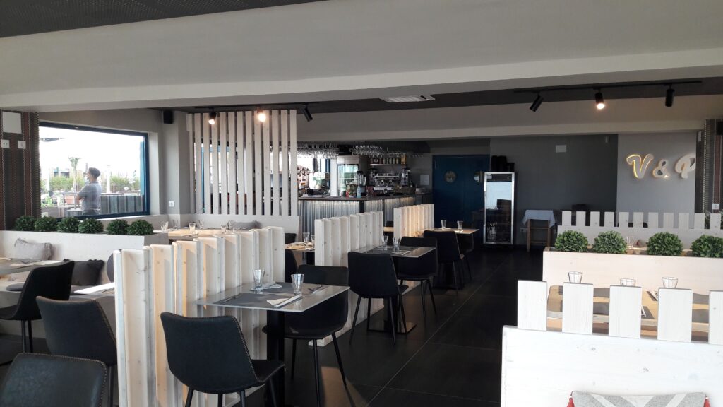 Restaurant situat a Empuriabrava, es troba a primera línia de mar, el client volia crear un espai interior agradable, on convidés a entrar, està situat en una zona on predominen els restaurant d’un estil marítim per això volien fugir dels colors blaus i blancs i crear un espai amb tonalitats fosques, però íntim i acollidor.